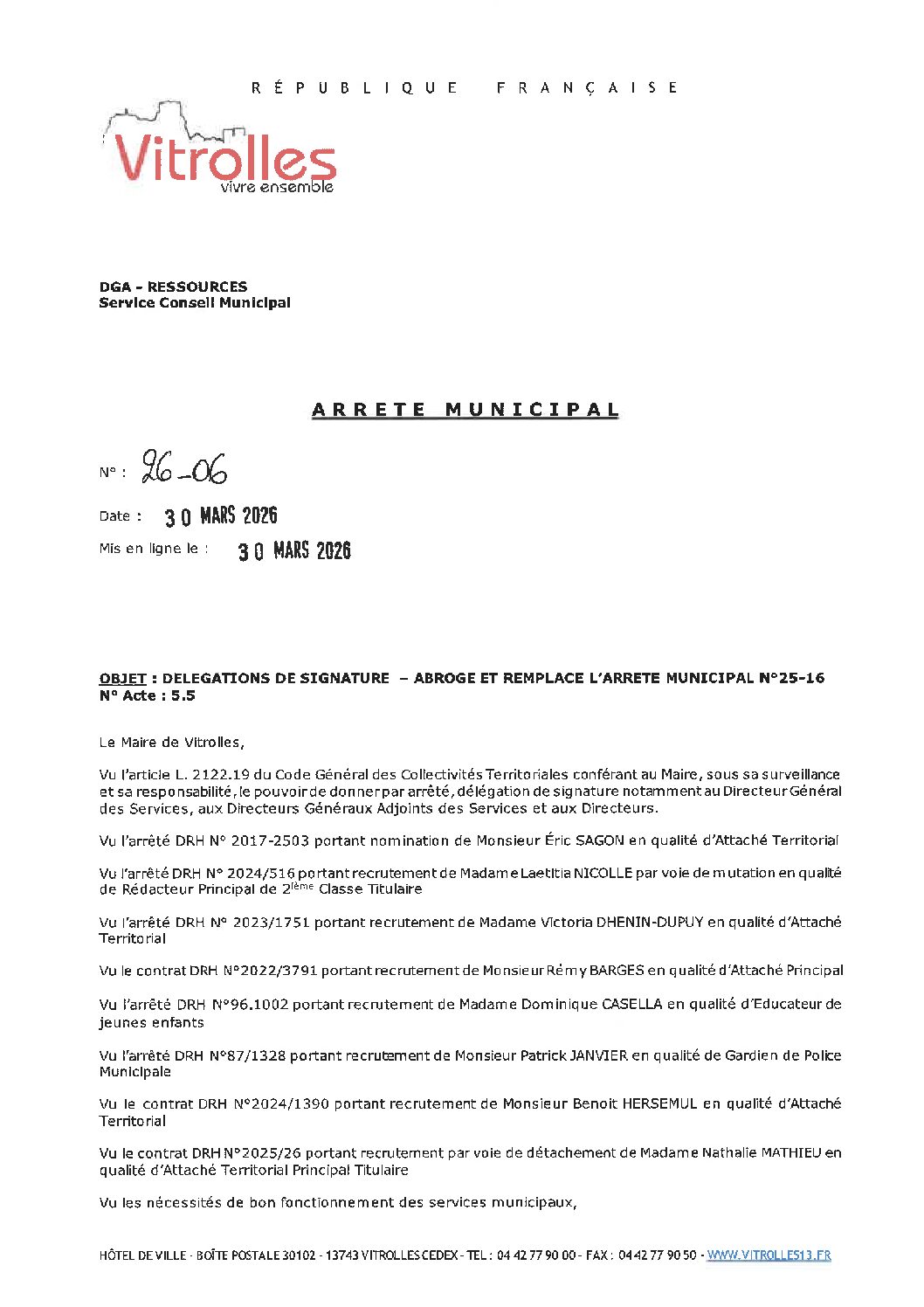 AM 26-06 Délégation de signature – Abroge et remplace l'arrêté municipal N°25-16