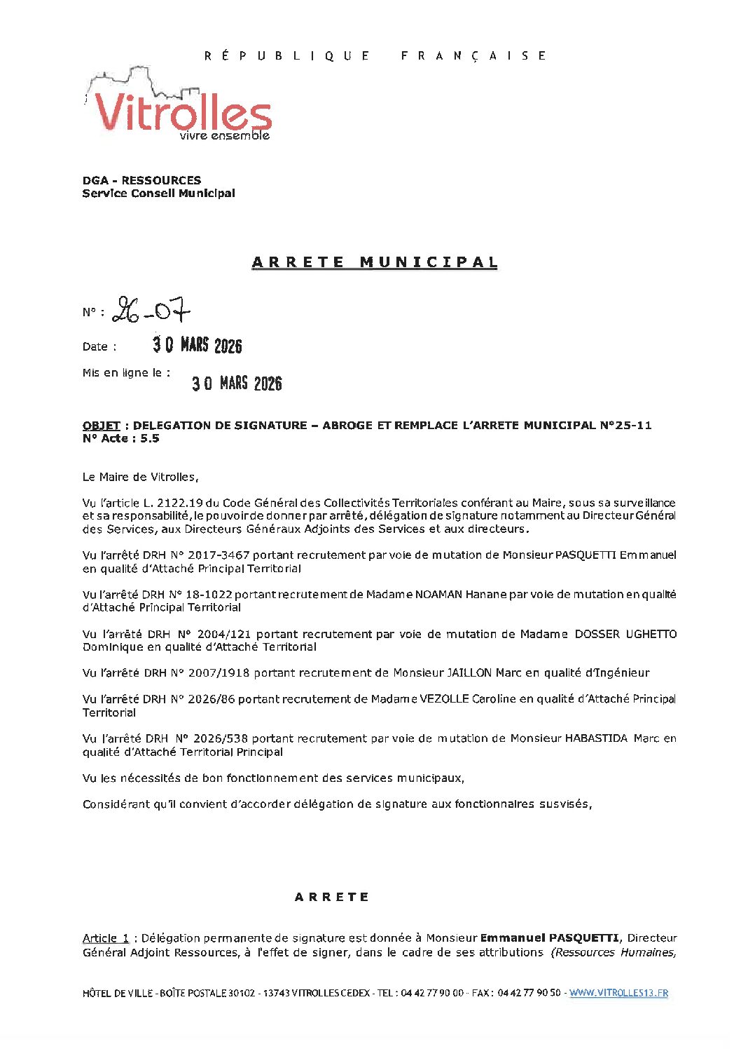 AM 26-07 Délégation de signature – Abroge et remplace l'arrêté municipal N°25-11