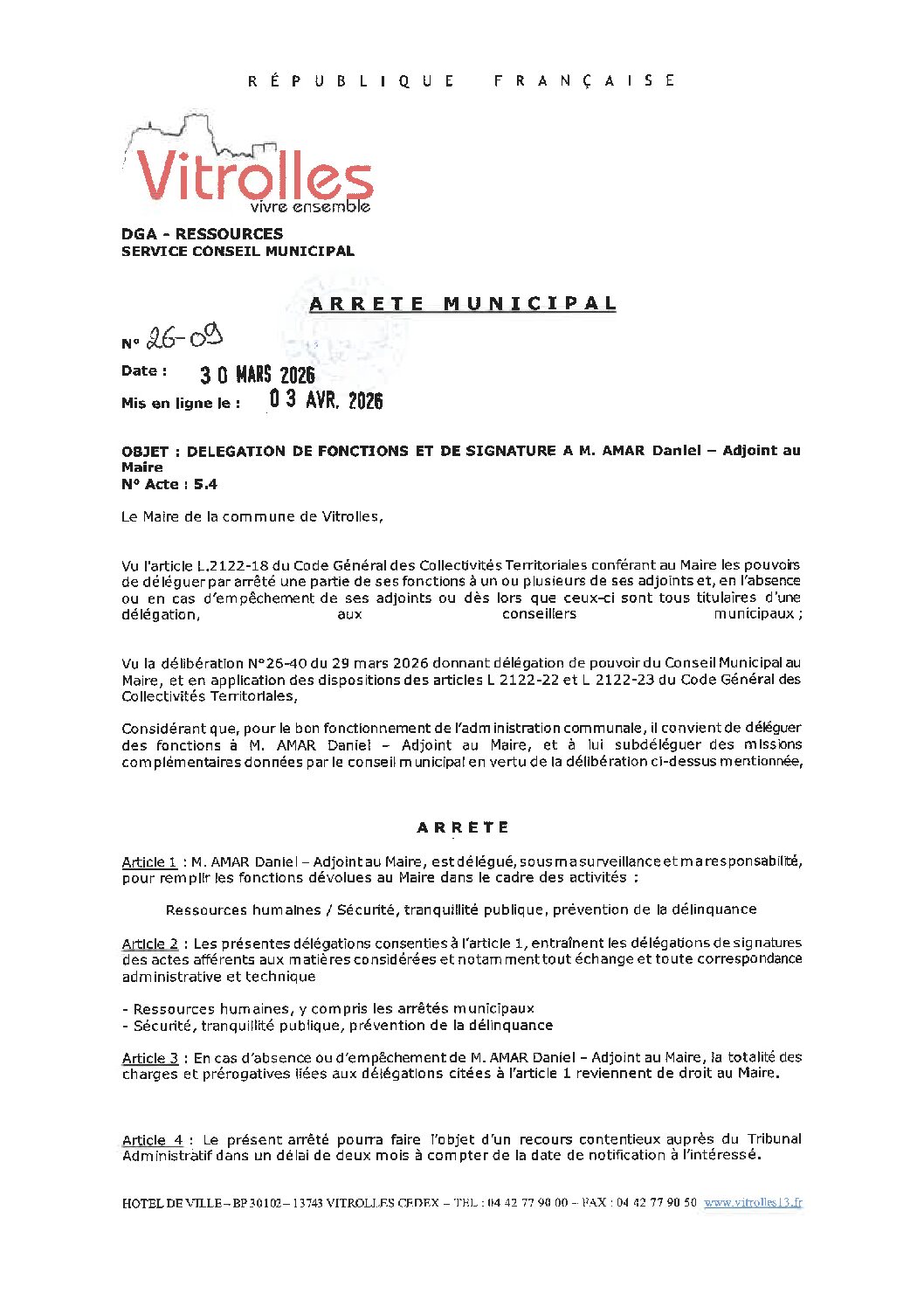 AM 26-09 DELEGATION DE FONCTIONS ET DE SIGNATURE A M. AMAR Daniel – Adjoint au Maire