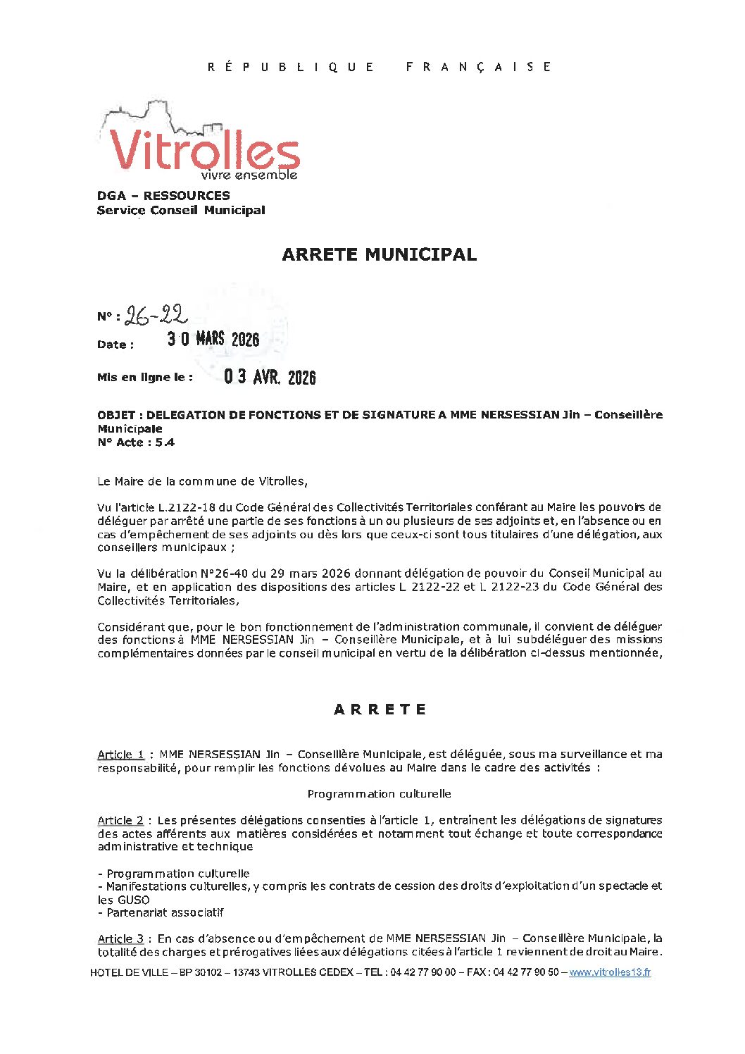 AM 26-22 DELEGATION DE FONCTIONS ET DE SIGNATURE A MME NERSESSIAN Jin – Conseillère Municipale