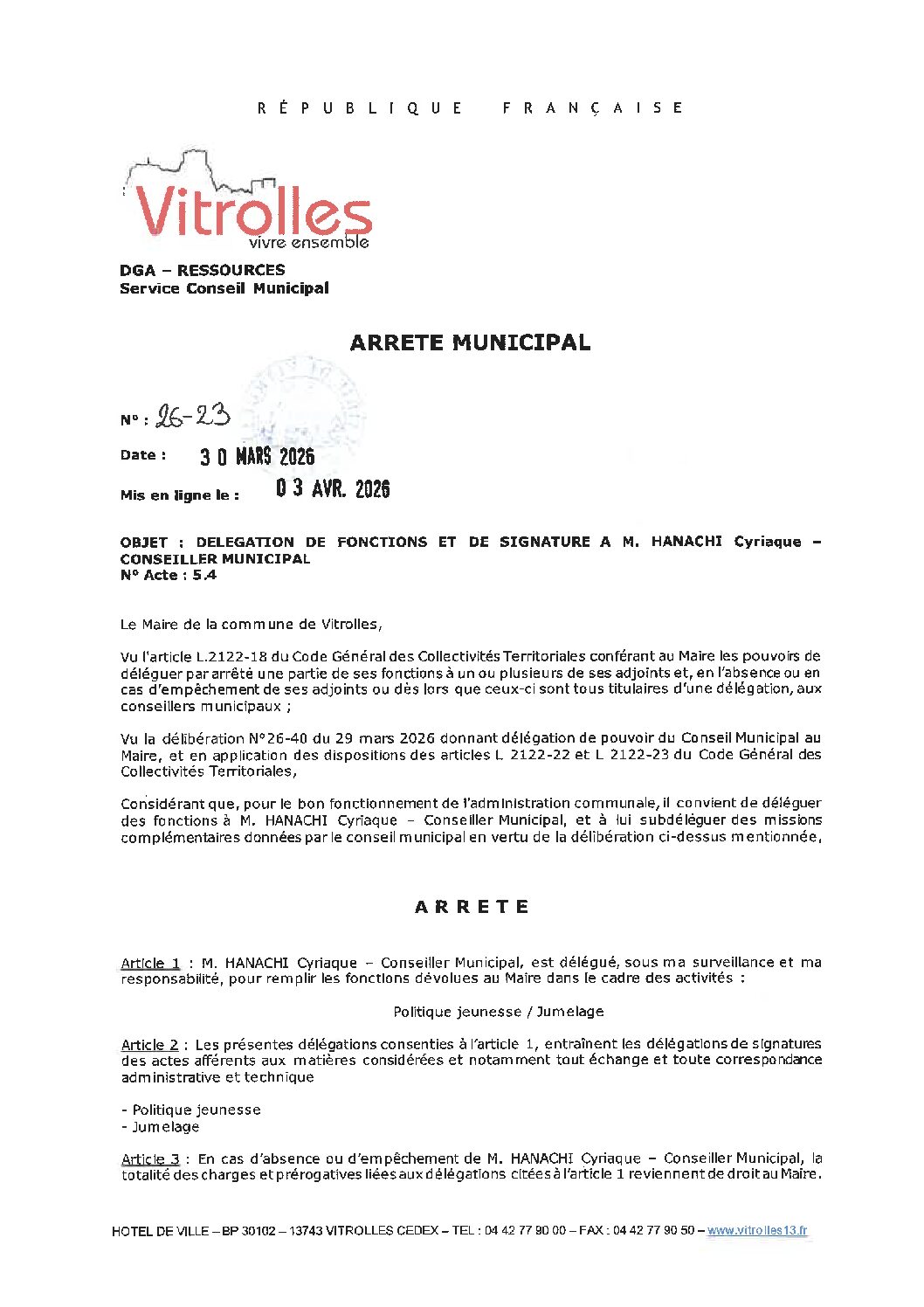 AM 26-23 DELEGATION DE FONCTIONS ET DE SIGNATURE A M. HANACHI Cyriaque – CONSEILLER MUNICIPAL