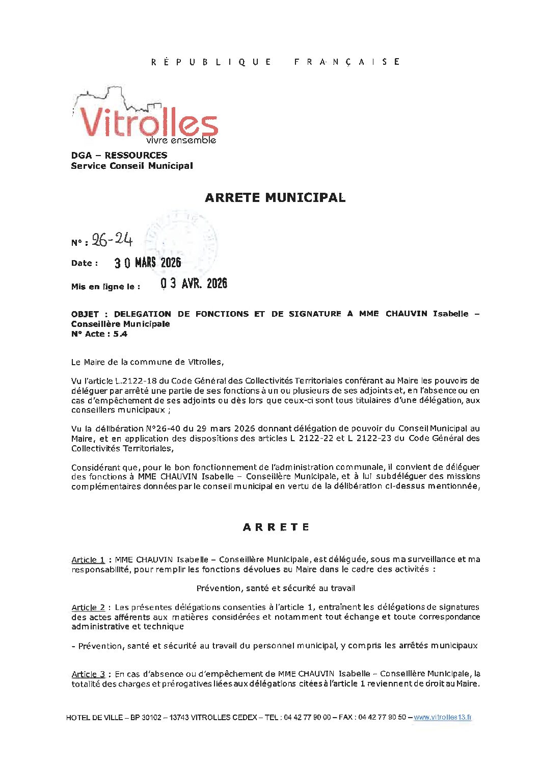 AM 26-24 DELEGATION DE FONCTIONS ET DE SIGNATURE A MME CHAUVIN Isabelle – Conseillère Municipale