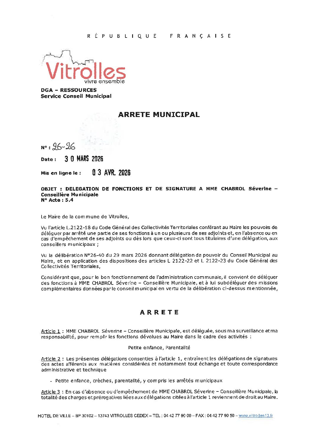 AM 26-26 DELEGATION DE FONCTIONS ET DE SIGNATURE A MME CHABROL Séverine – Conseillère Municipale