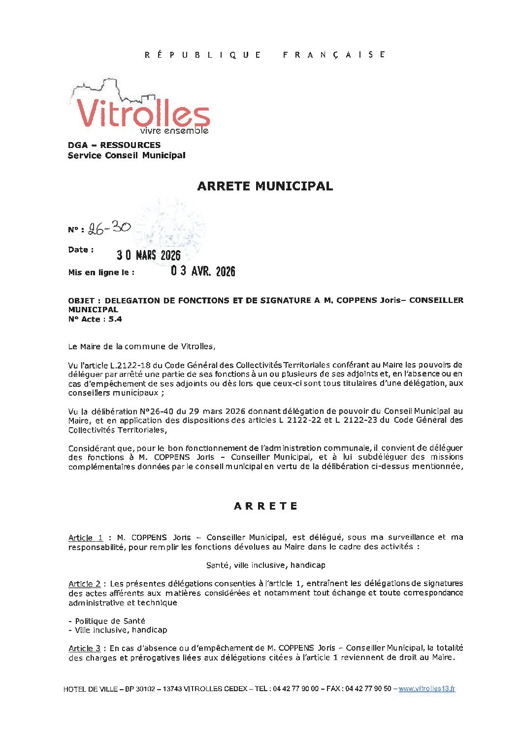 AM 26-30 DELEGATION DE FONCTIONS ET DE SIGNATURE A M. COPPENS Joris– CONSEILLER MUNICIPAL