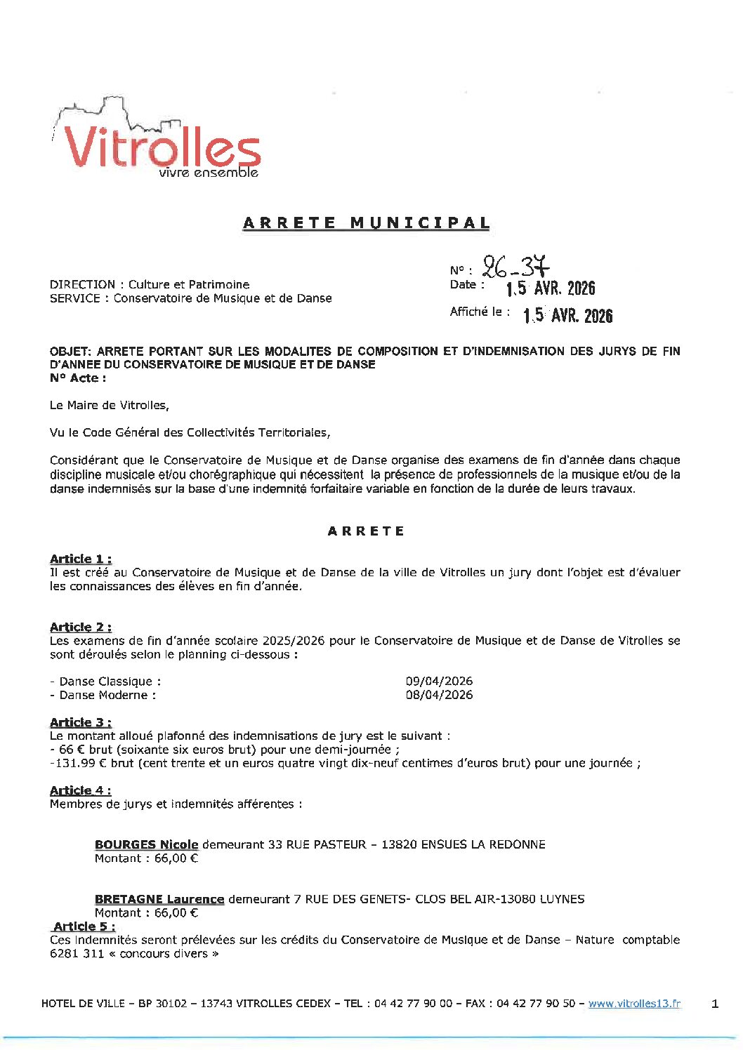 AM 26-37 Arrêté portant sur les modalités de composition et d'indemnisation des jurys de fin d'année du conservatoire de musique et de danse