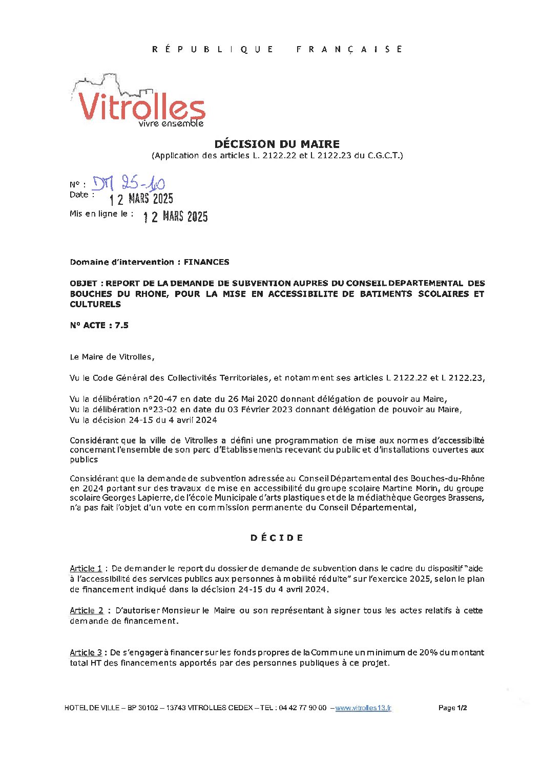 Décisions du maire:DM 25-10Report de la demande de subvention auprès du conseil départemental des Bouches du Rhône, pour la mise en accessibilité de bâtiments scolaires et culturels