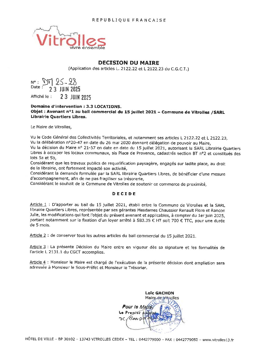 DM 25-28 Avenant n°1 au bail commercial du 15 juillet 2021 – Commune de Vitrolles / SARL Librairie Quartiers Libres1