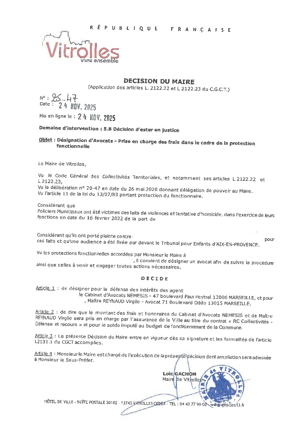 DM 25-47 Désignation d'avocats – Prise en charge des frais dans le cadre de la protection fonctionnelle