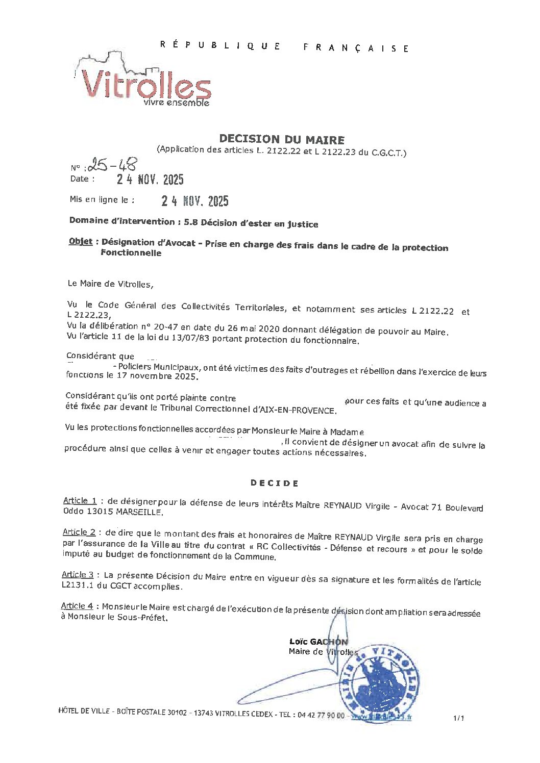 DM 25-48 Désignation d'avocat – Prise en charge des frais dans le cadre de la protection fonctionnelle