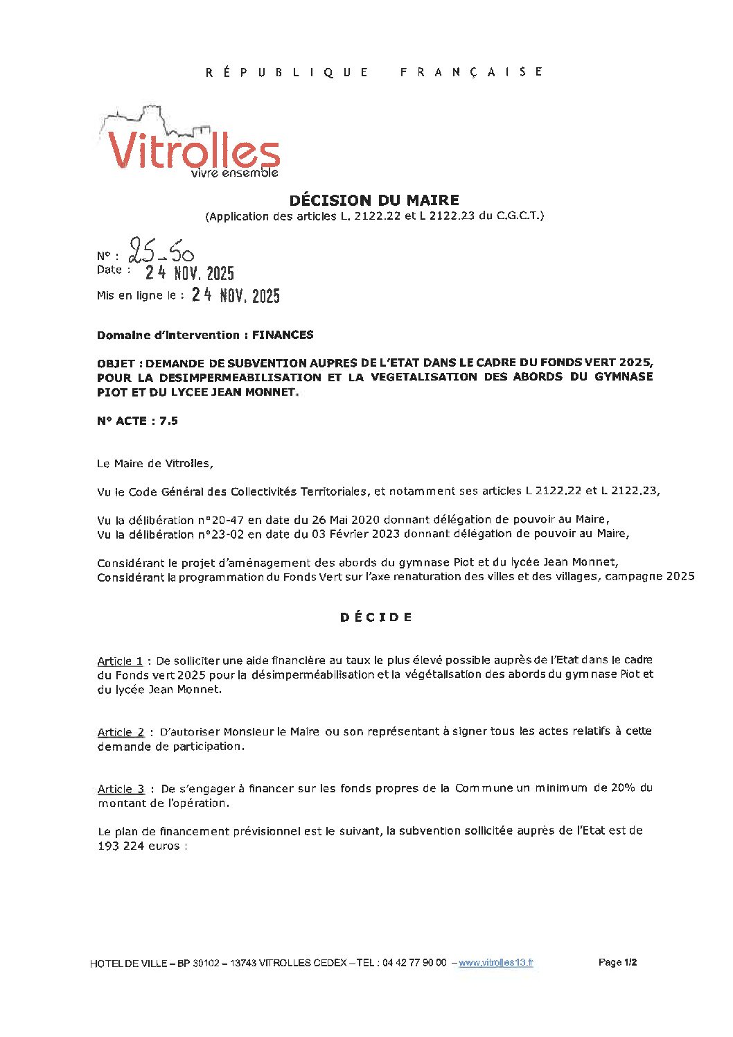 DM 25-50 Demande de subvention auprès de l'Etat dans le cadre du fonds vert 2025, pour la désimperméabilisation et la végétalisation des abords du gymnase Piot et du lycée Jean Monnet