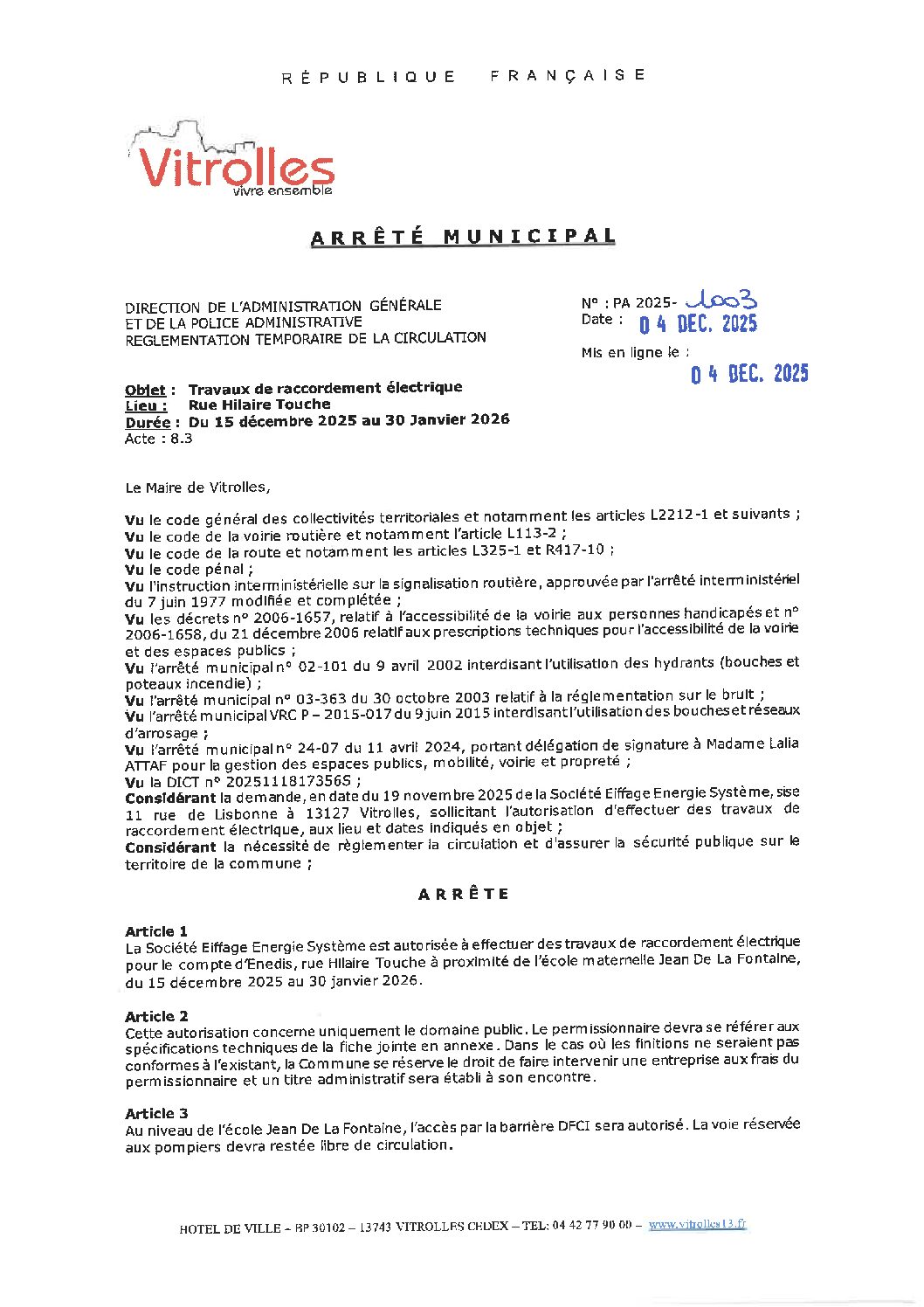 Arrêtés : PA 2025-1003 Règlementation de la circulation – Rue Hilaire Touche