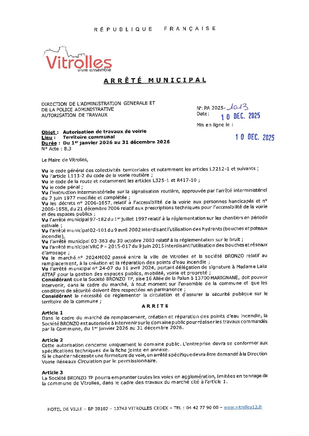 Arrêtés : PA 2025-1013 Annuel BRONZO TP – Travaux de voirie sur la commune