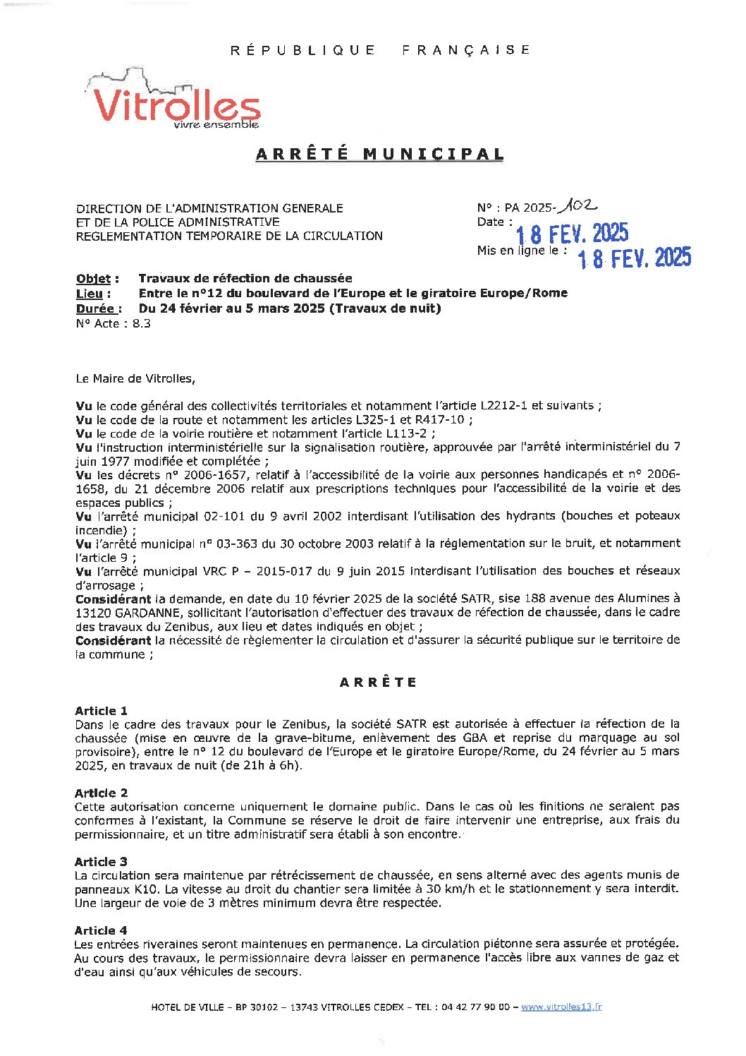 PA 2025-102 Règlementation temporaire de la circulation – Entre le n° 12 Bd Europe et giratoire Europe – Rome