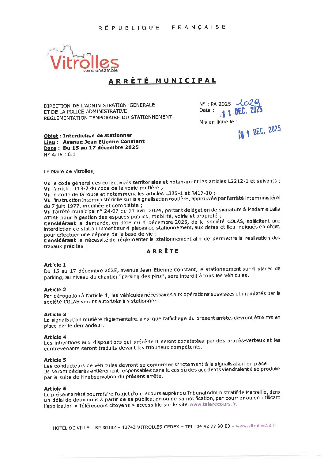 Arrêtés : PA 2025-1029 Interdiction de stationner – Avenue Jean Etienne Constant