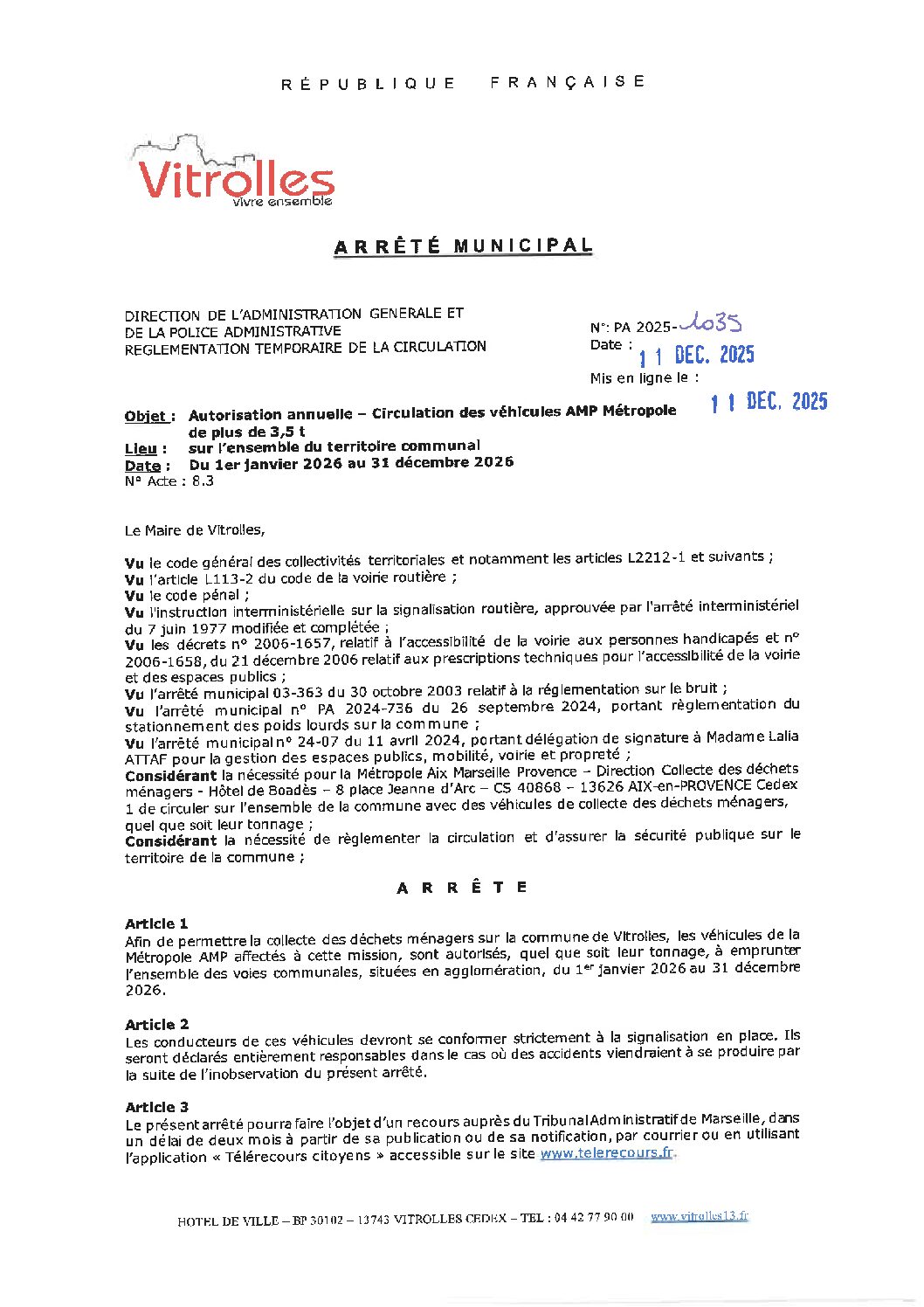 Arrêtés : PA 2025-1035 ANNUEL Métropole AMP