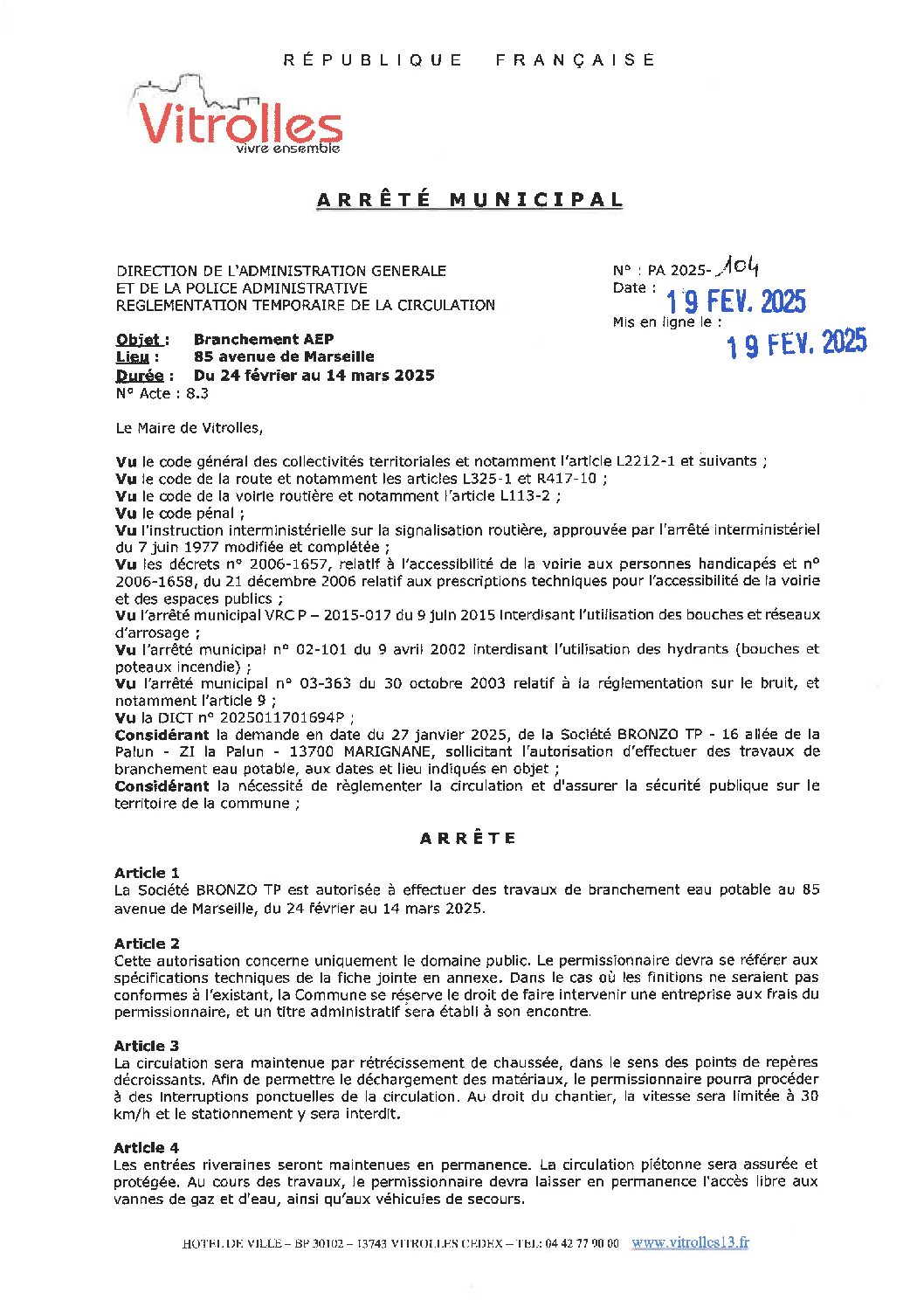 PA 2025-104 Règlementation temporaire de la circulation – Avenue de Marseille