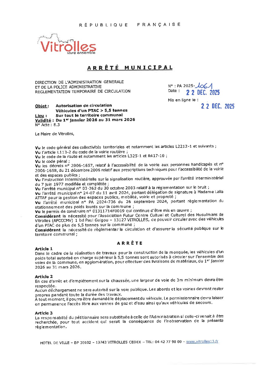 Arrêtés : PA 2025-1061 Annuel – Autorisation plus de 5,5t livraison Mosquée