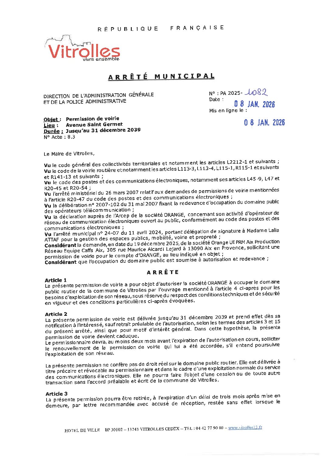 Arrêtés : PA 2025-1082 Permission de voirie ORANGE – Avenue Saint Germet
