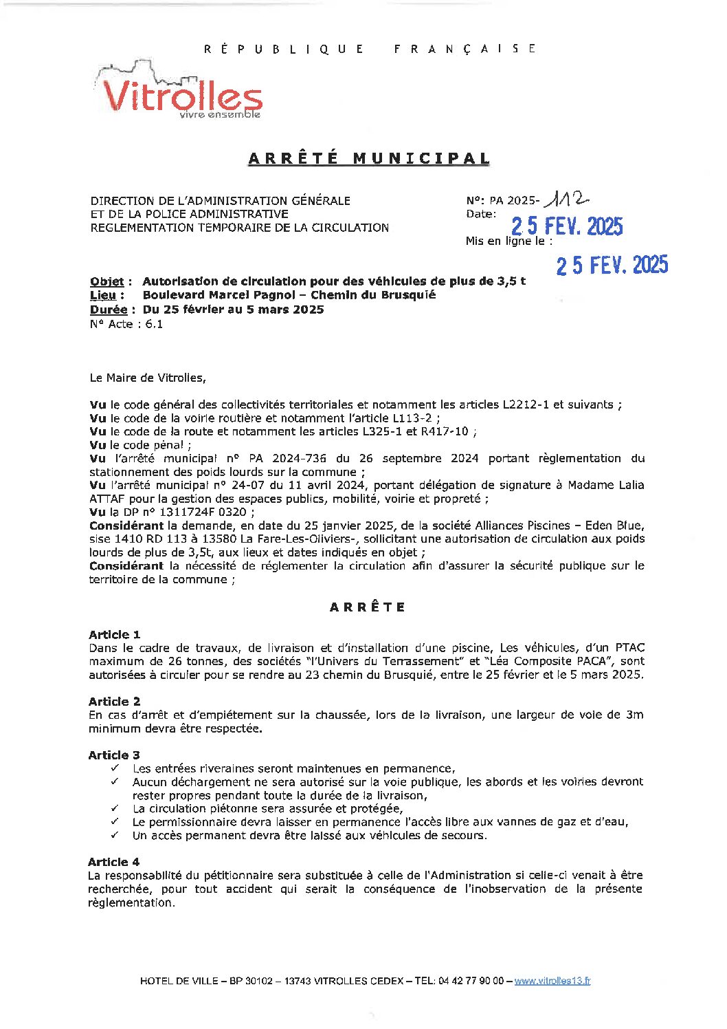 PA 2025-112 Règlementation temporaire de la circulation – Bd M Pagnol et chemin du Brusquié