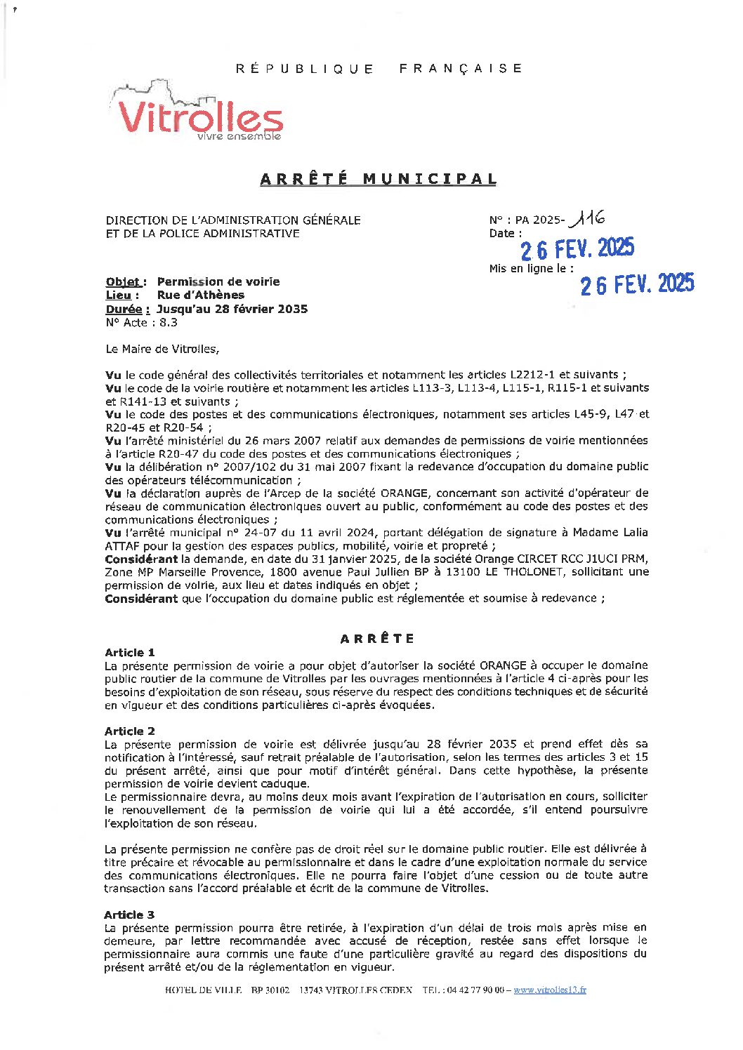 • PA 2025-116 Permission de voirie ORANGE CIRCET