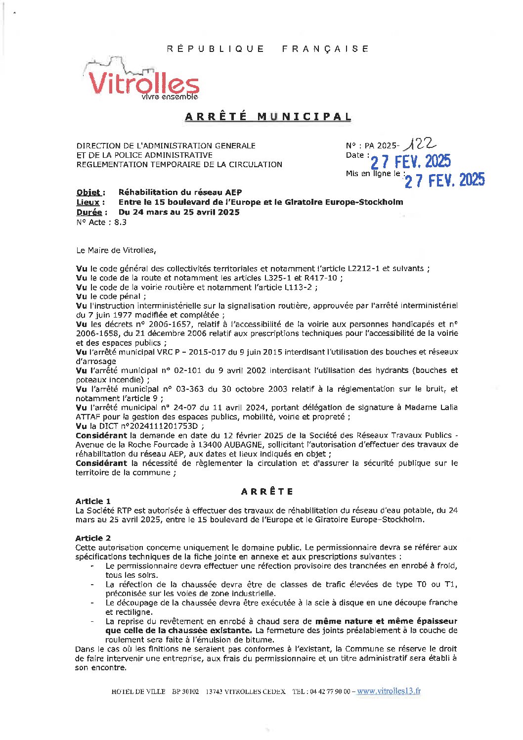PA 2025-122 Règlementation temporaire de la circulation – Entre le 15 Bd de l Europe et le giratoire Europe – Stockholm