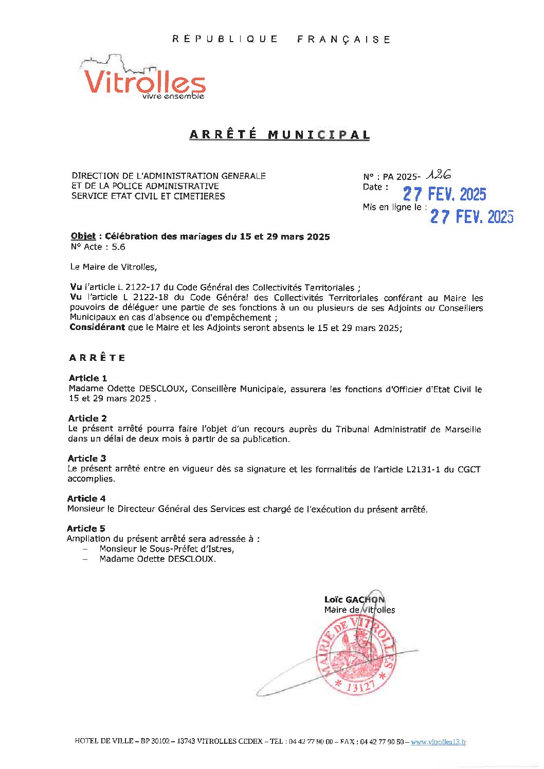 Arrêtés : PA 2025-126 Célébration des mariages du 15 et 29 mars 2025