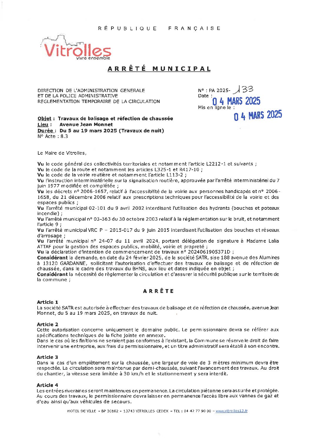 PA 2025-133 Règlementation temporaire de la circulation – Avenue Jean Monnet