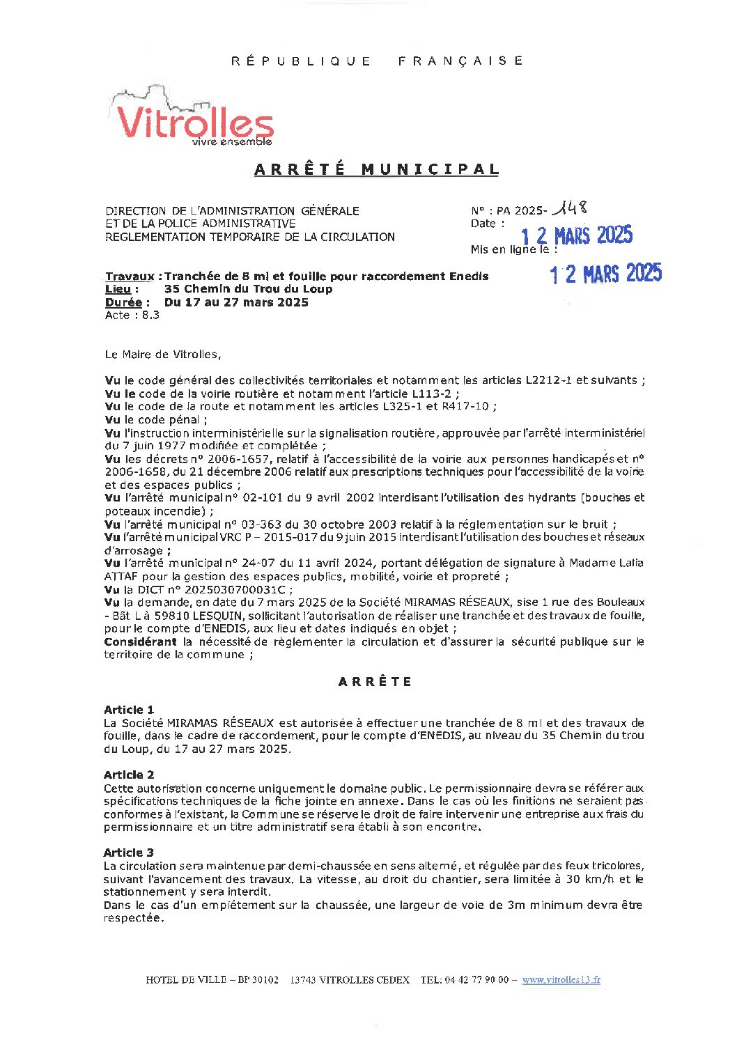 PA 2025-148 Règlementation temporaire de la circulation – Chemin du Trou du Loup