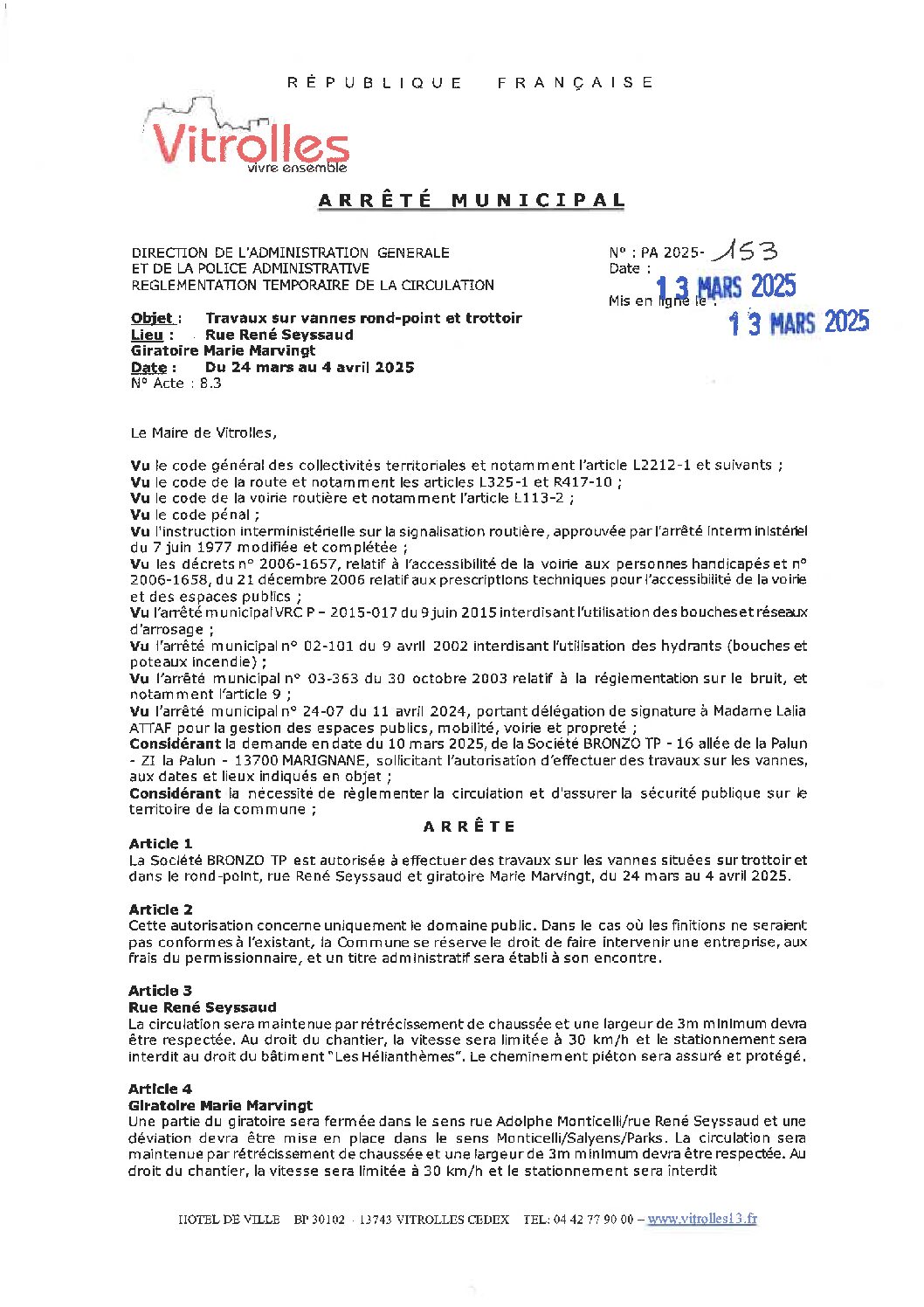 PA 2025-153 Règlementation temporaire de la circulation et stationnement – Rue René Seyssaud – Giratoire Marie Marvingt