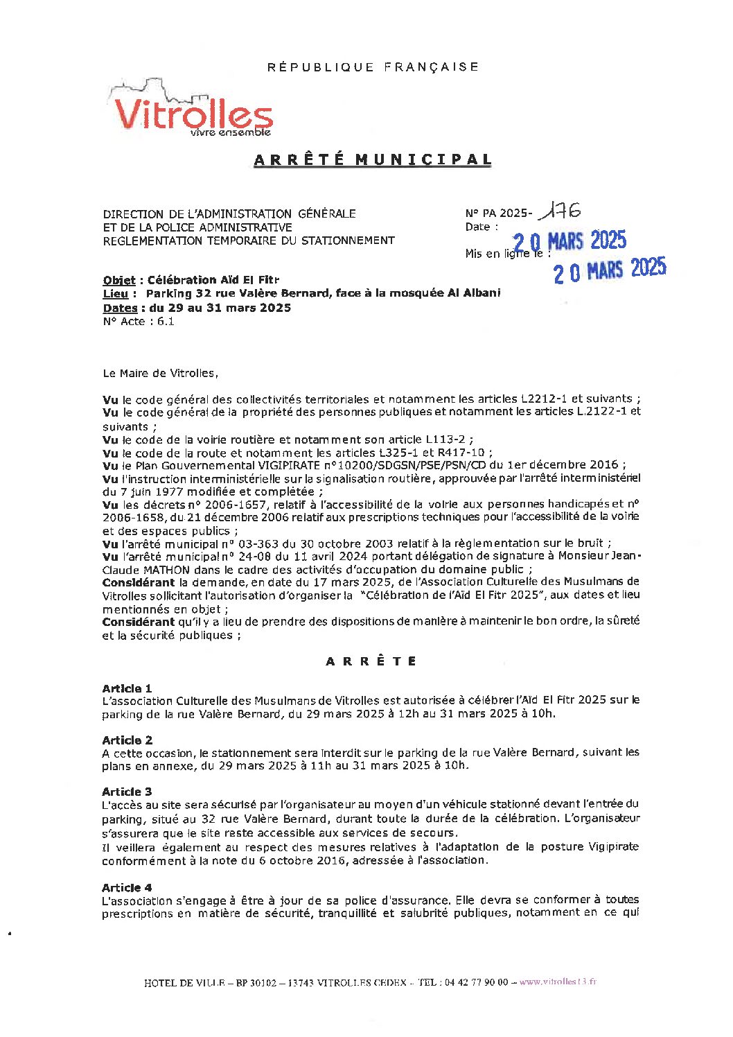 Arrêtés : PA 2025-176 Célébration Aïd El Fitr 2025