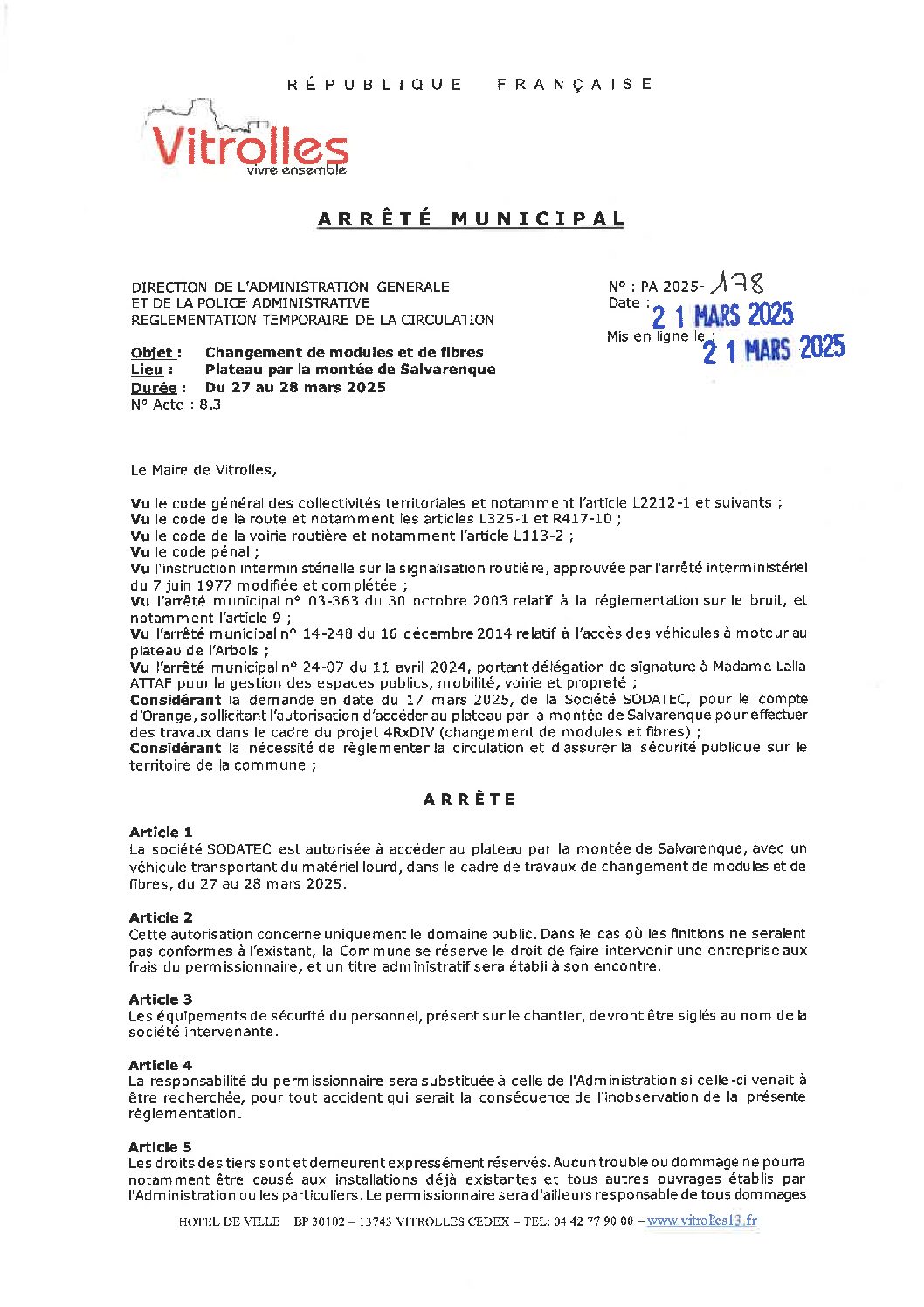 • PA 2025-178 Règlementation temporaire de la circulation – Salvarenque
