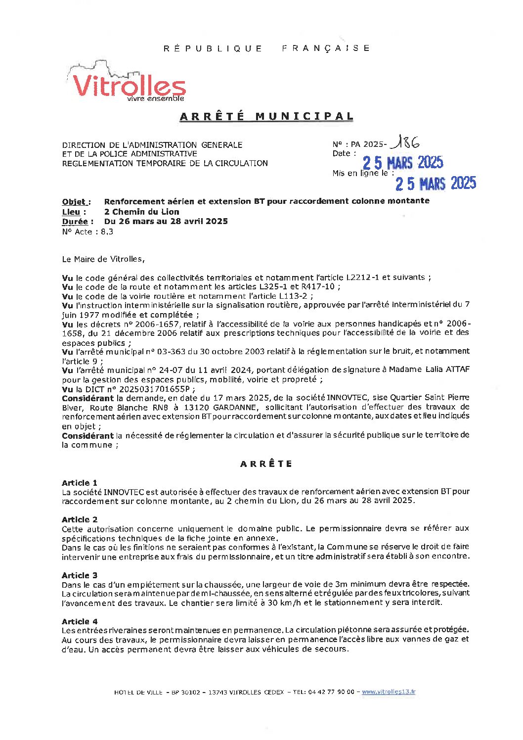 Arrêtés : PA 2025-186 Règlementation de la circulation – Chemin du Lion