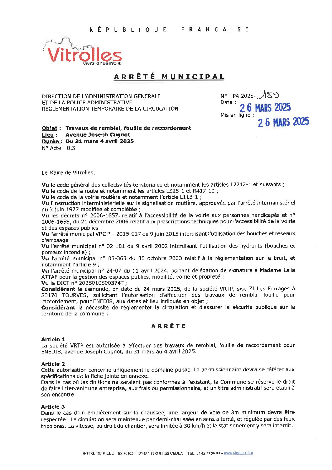 Arrêtés : PA 2025-189 Autorisation de travaux VRTP pour GRDF – Avenue Joseph Cugnot