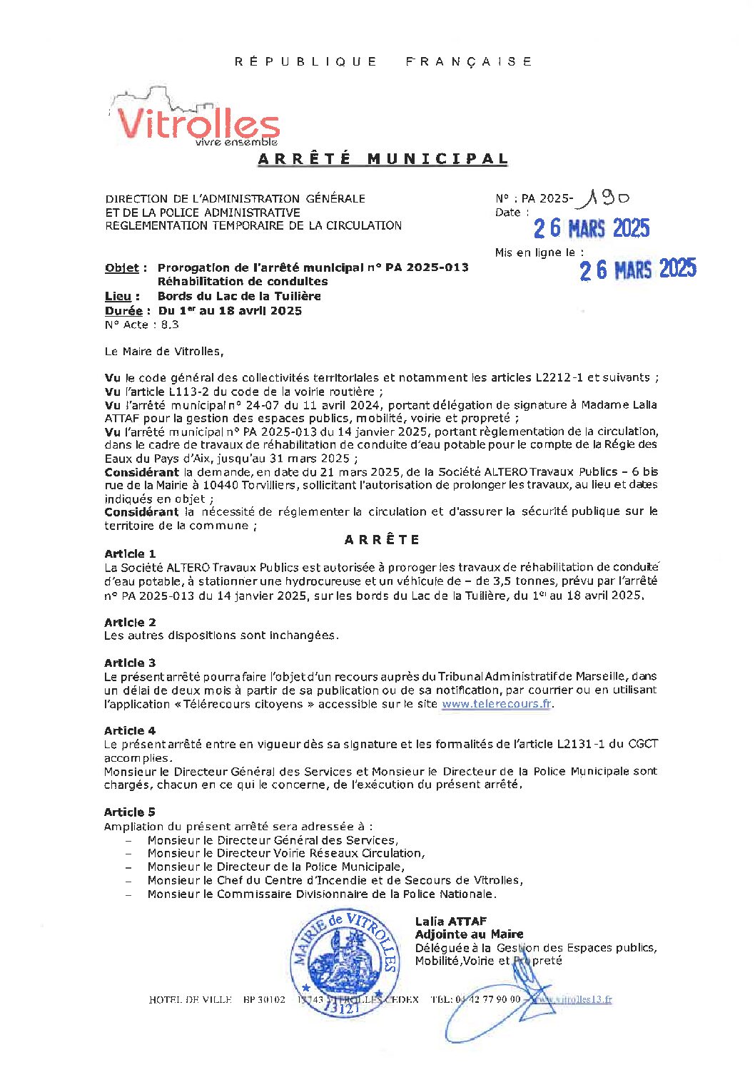 PA 2025-190 Règlementation temporaire de la circulation – Lac de la Tuilière