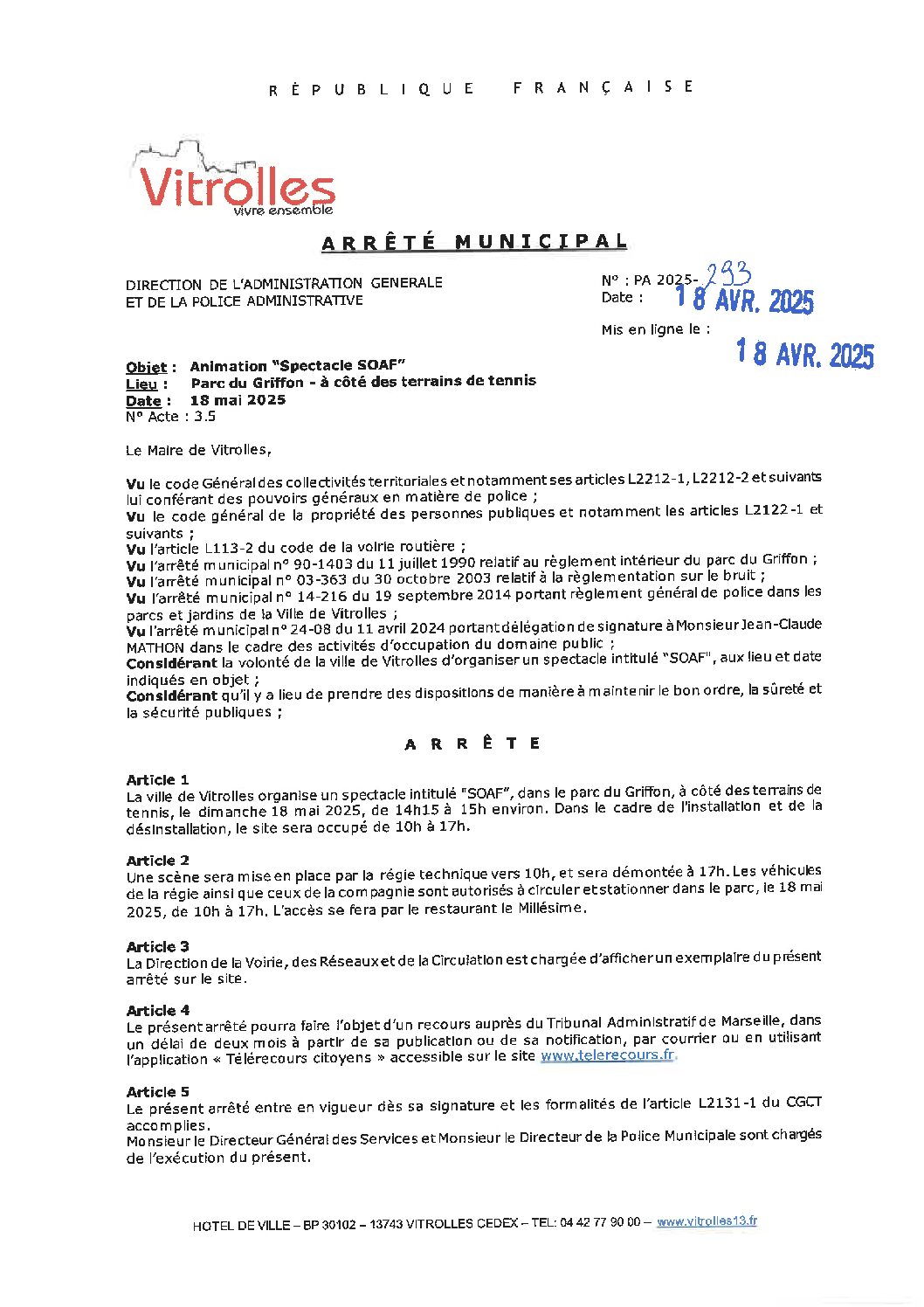 Arrêtés : PA 2025-293 Spectacle SOAF – Parc du Griffon