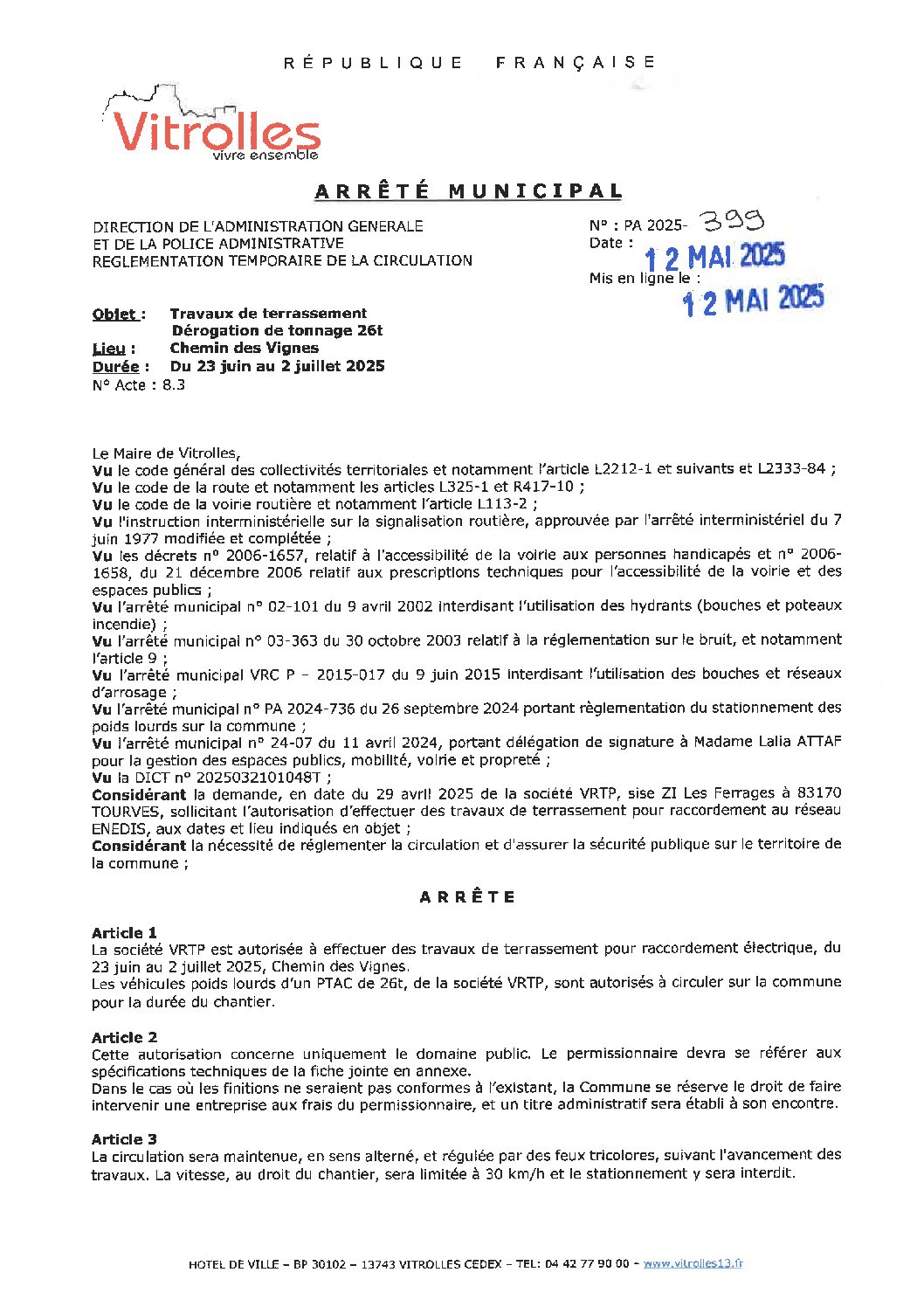 PA 2025-399 Règlementation temporaire de la circulation – Chemin des Vignes