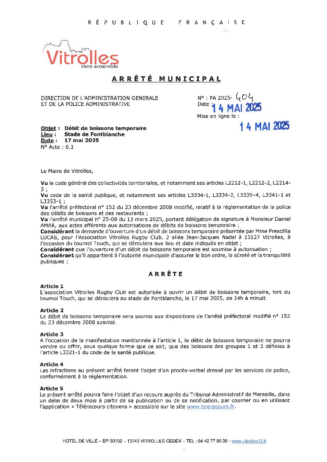 Arrêtés : PA 2025-404 DB Tournoi Touch – Stade Fontblanche