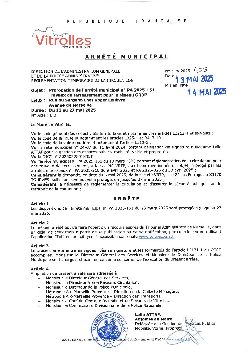 PA 2025-405 Autorisation de travaux VRTP – Prorogation du PA 2025-151 – Avenue de Marseille