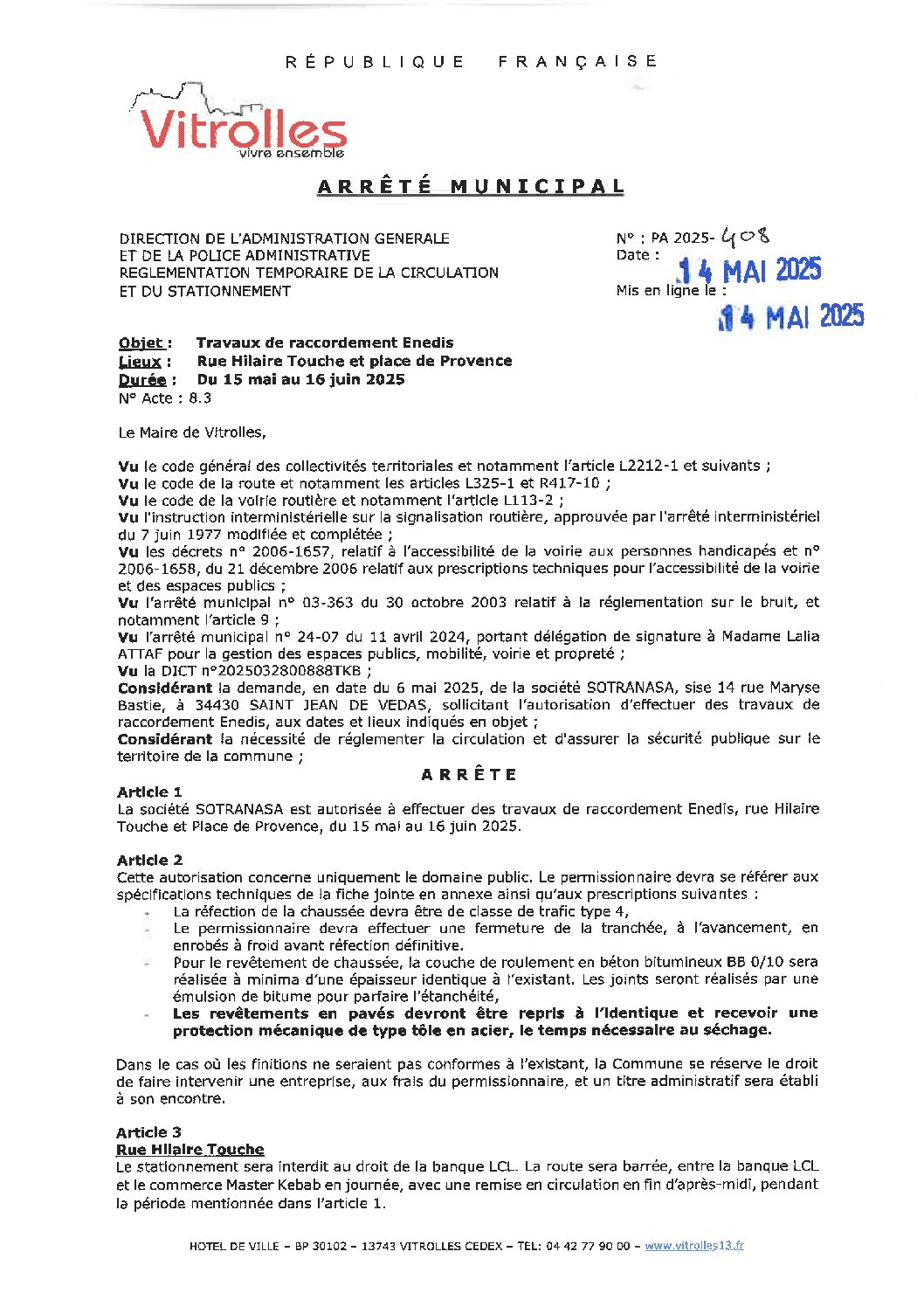 PA 2025-408 Règlementation temporaire de la circulation – Rue Hilaire Touche et Place de Provence