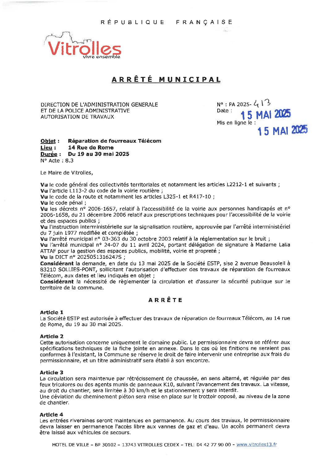 Arrêtés : PA 2025-413 Autorisation de travaux – Rue de Rome