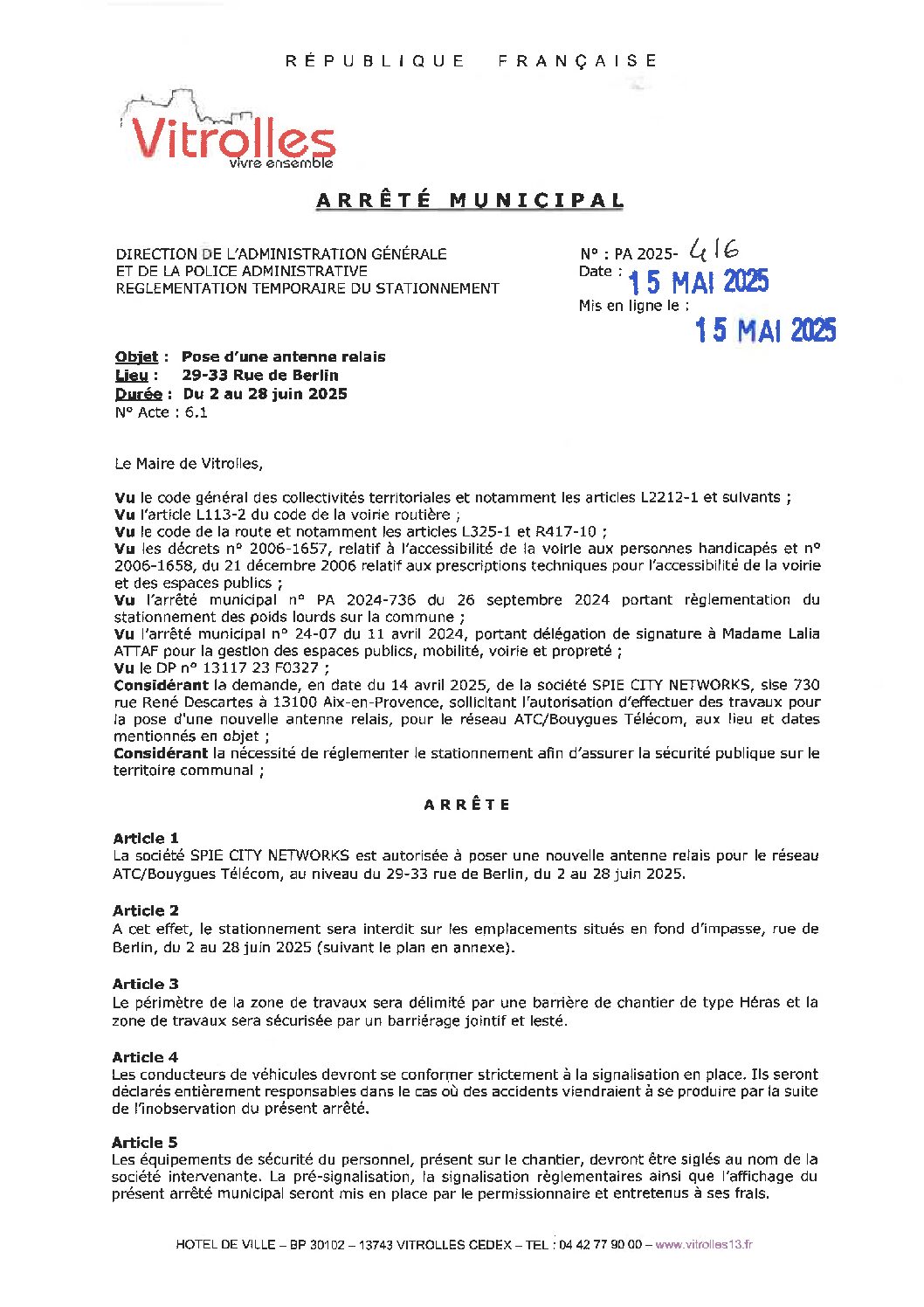 Arrêtés : PA 2025-416 Autorisation temporaire de stationnement – Rue de Berlin
