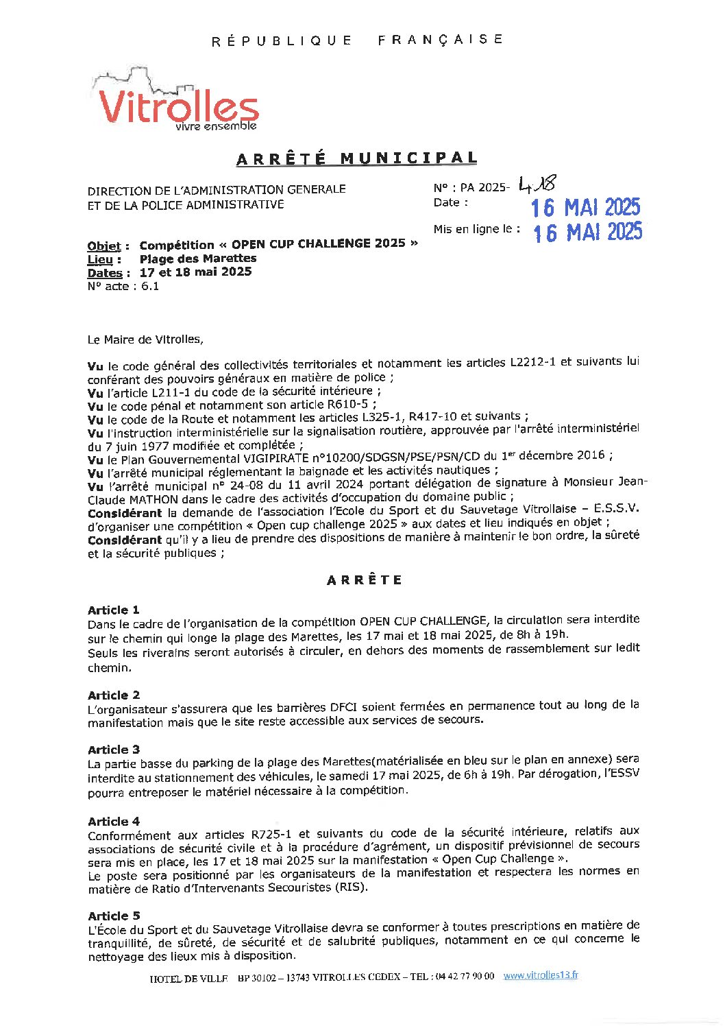 Arrêtés : PA 2025-418 Open Cup Challenge – Plage des Marettes