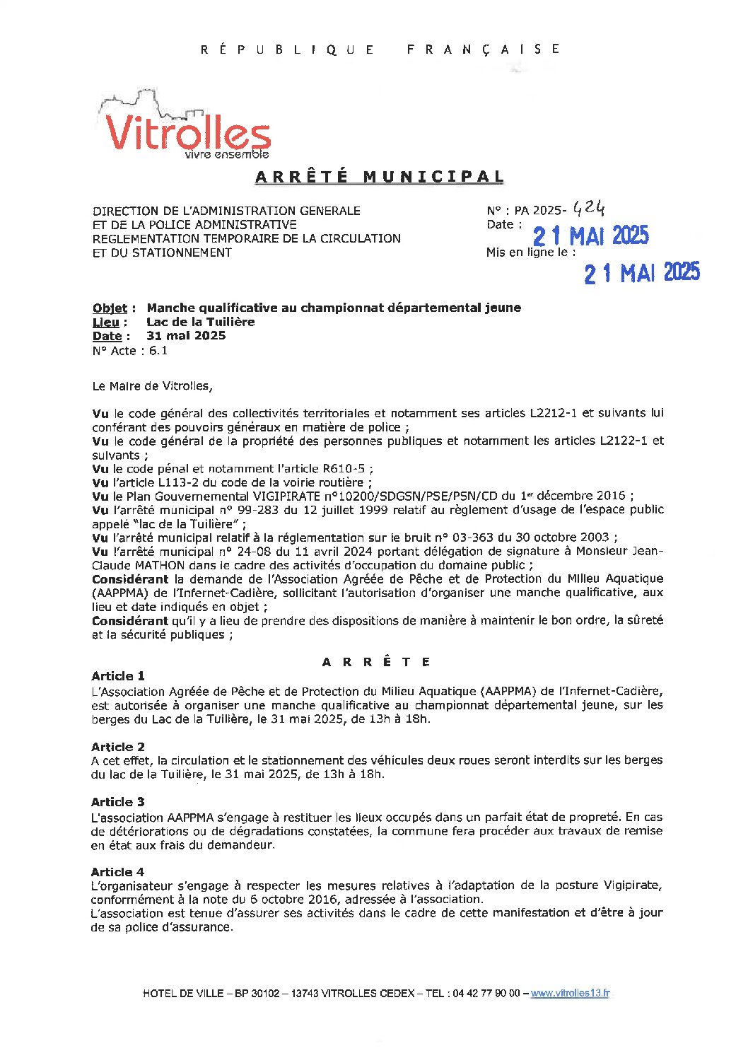 Arrêtés : PA 2025-424 Concours de Pêche – Lac de la Tuilière