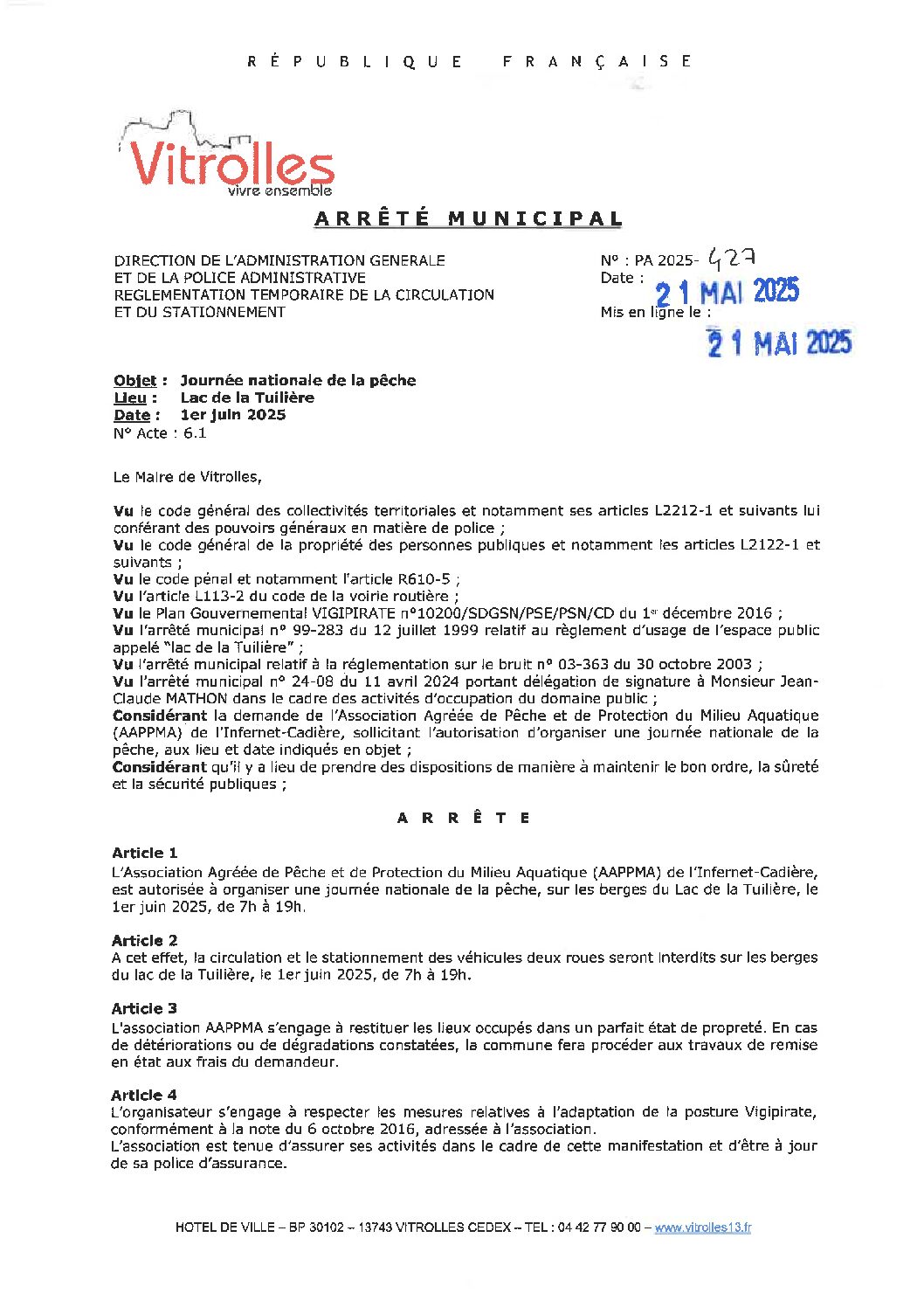 Arrêtés : PA 2025-427 Journée nationale de pêche – Lac de la Tuilière