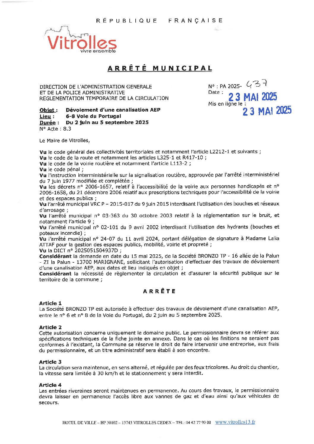 Arrêtés : PA 2025-437 èglementation temporaire de la circulation – Voie du Portugal