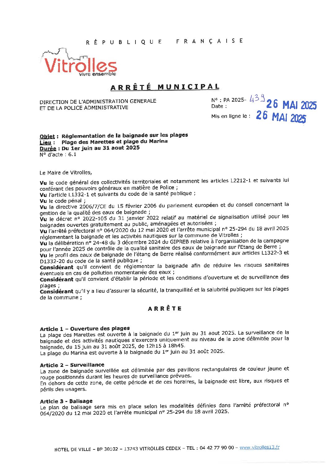Arrêtés : PA 2025-439 Règlementation de la baignade 2025
