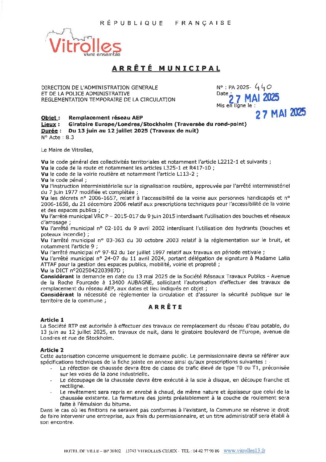 PA 2025-440 Règlementation temporaire de la circulation – Giratoire Bd de l Europe – Londres – Stockholm