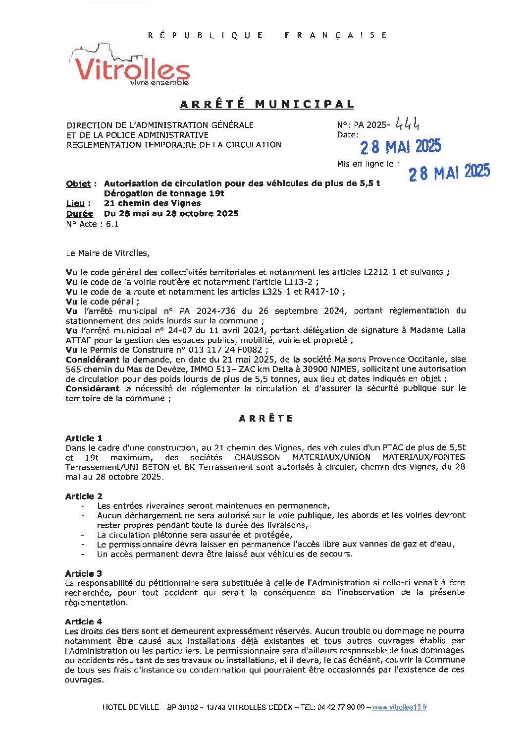 PA 2025-444 Règlementation temporaire de la circulation – 21 chemin des Vignes