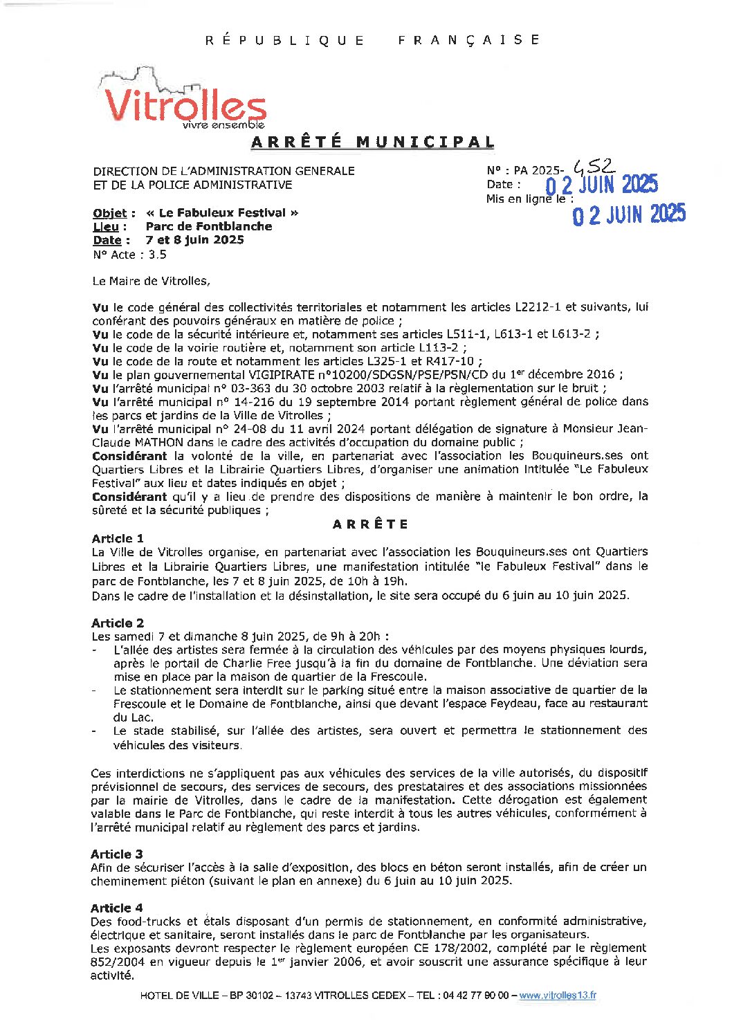 Arrêtés : PA 2025-452 Le Fabuleux Festival – Fontblanche