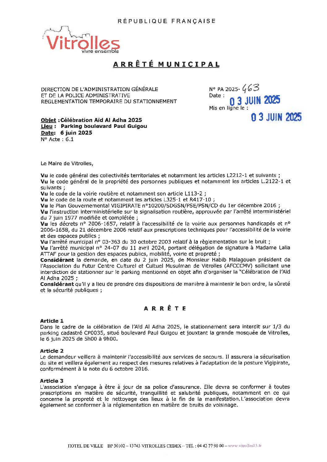 Arrêtés : PA 2025-463 Célébration Aïd Al Adha 2025 P. Guigou
